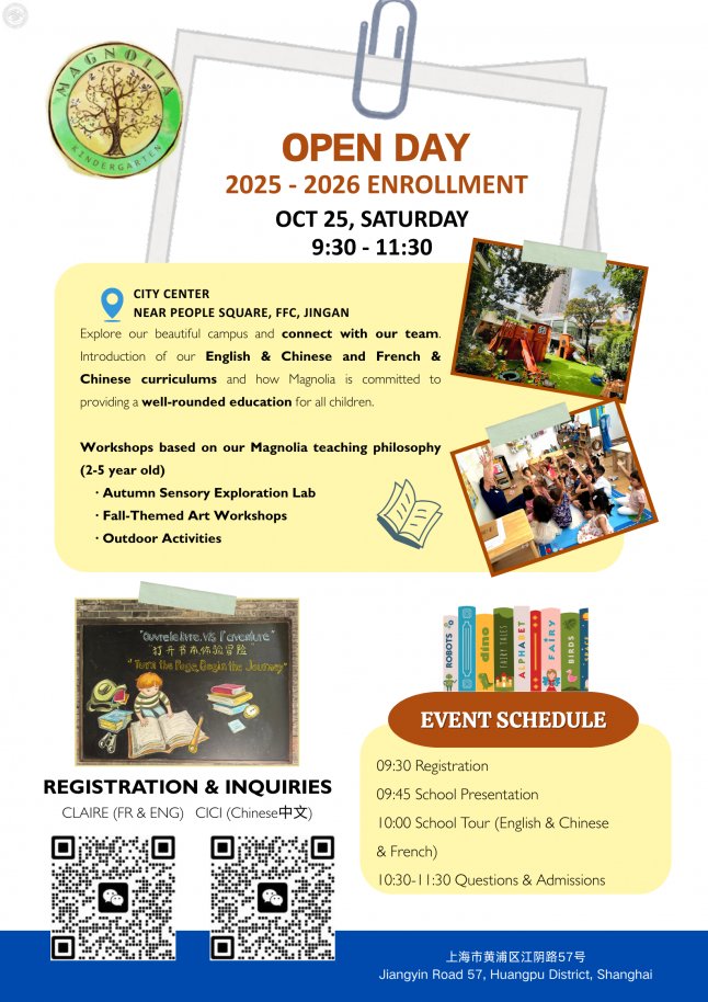 Magnolia School is hosting an Open Day on Saturday, Oct 25 (9:30–11:30am) at its City Center campus near People’s Square, FFC, and Jing’an. Families can tour the campus, meet the team, and learn about the school’s bilingual programs in English-Chinese and French-Chinese. The morning includes a school presentation, guided tours in multiple languages, and Q&A with admissions. Kids (ages 2–5) can join hands-on workshops like sensory play, themed art, and outdoor activities, all rooted in Magnolia’s teaching philosophy. Registration is free—contact Claire (FR/EN) or Cici (CN) for details.