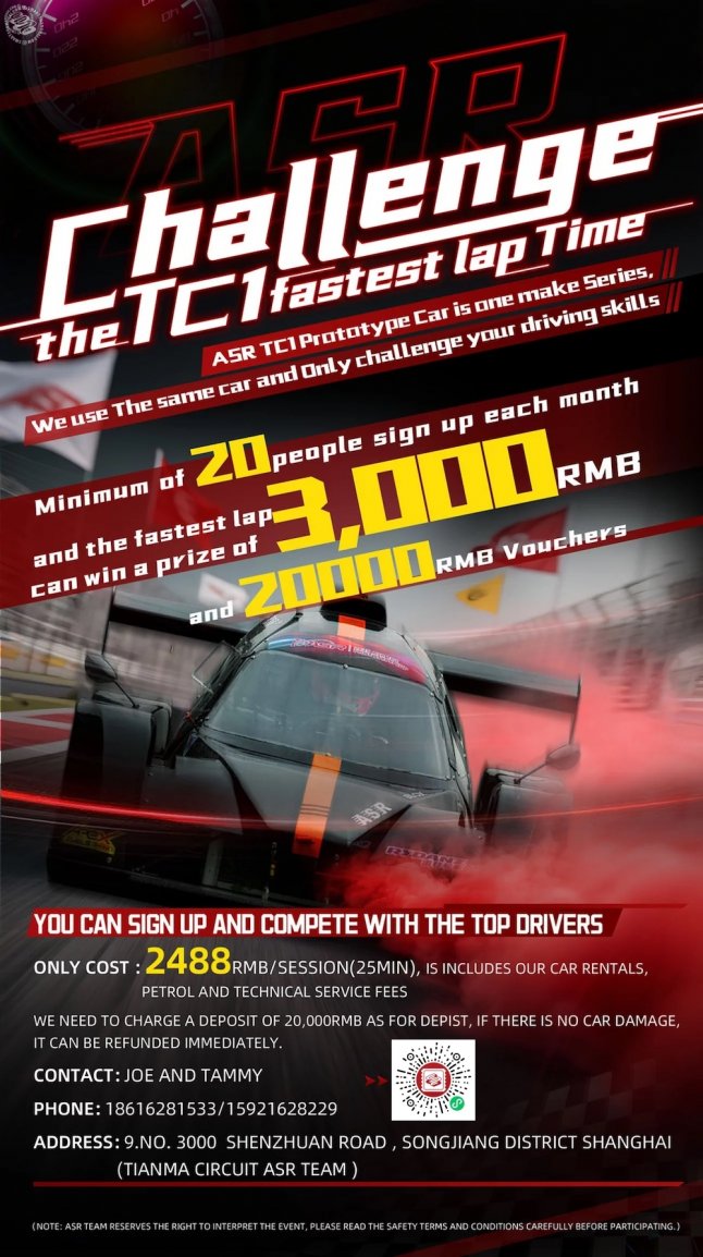 The 2025 TC1 Lap Challenge is now open at Tianma Circuit in Songjiang. This standardized time attack event lets licensed drivers test their skills in identical ASR TC1 prototype race cars built to FIA specs. Monthly sessions run on the circuit’s F4 layout, with cash rewards for top times.