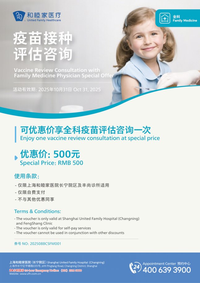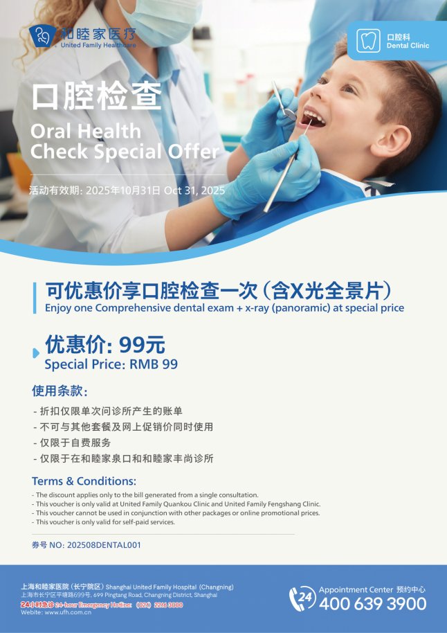 United Family Healthcare is offering a set of discounted health check vouchers, valid through October 31, 2025. Options include vision screening, oral health checks (with panoramic X-ray), and middle ear exams, all at 99rmb each as well as a vaccine consultation with a family medicine physician for 500rmb. Vouchers are for self-pay only, can’t be combined with other promotions, and only valid at specific location.