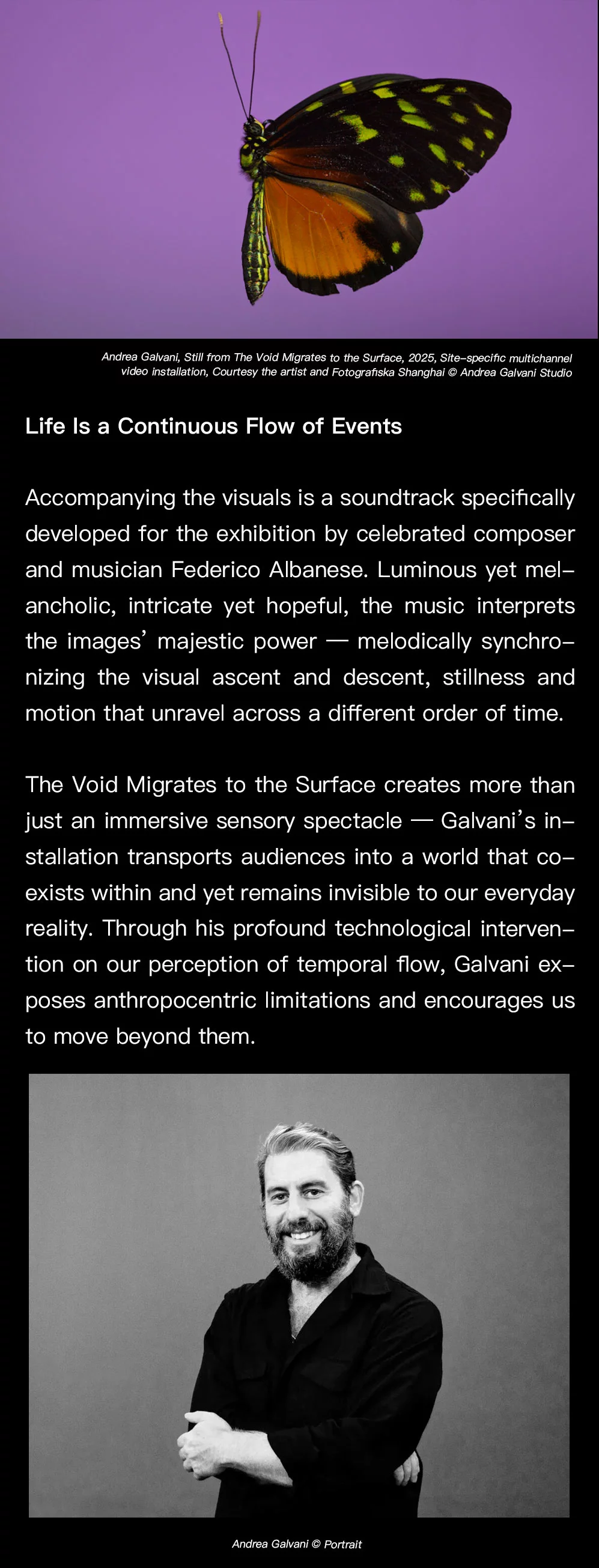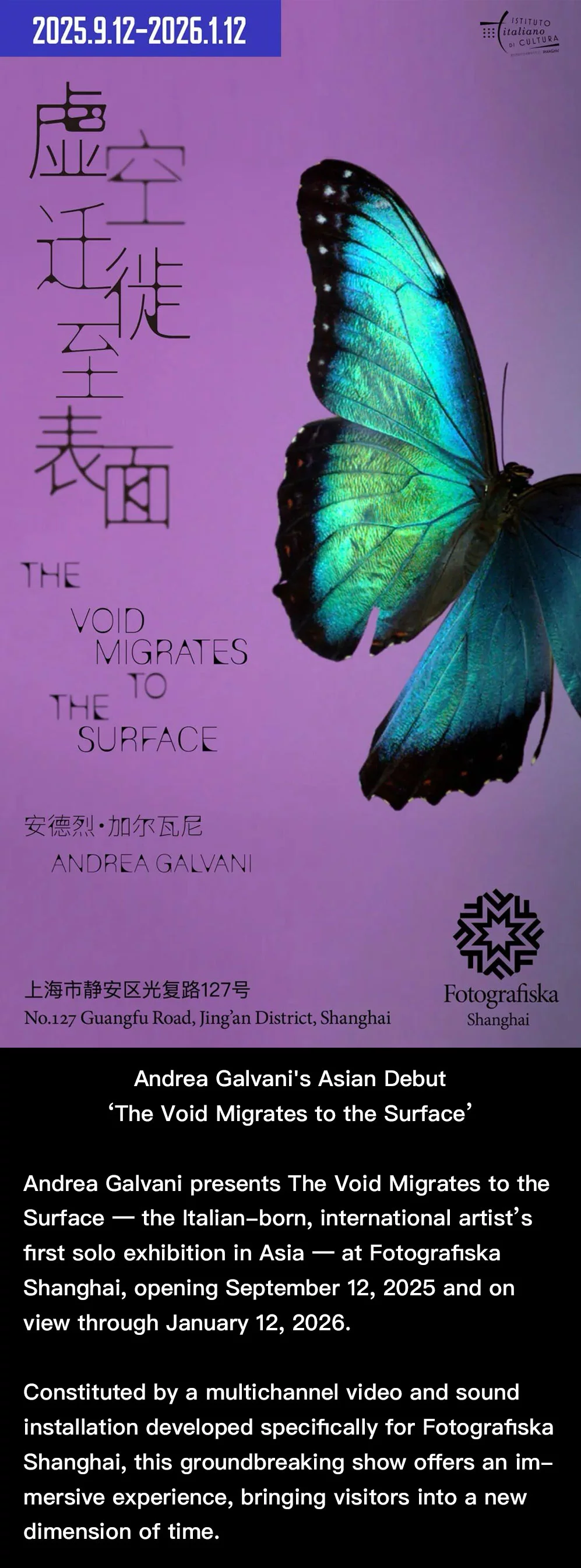 Italian artist Andrea Galvani brings his first solo show in Asia to Fotografiska Shanghai with The Void Migrates to the Surface. Expect a hypnotic mix of super-slow-motion butterflies, immersive soundscapes, and glowing purple worlds that stretch time itself. It’s a trippy, cinematic installation that makes you rethink what it means to be alive.