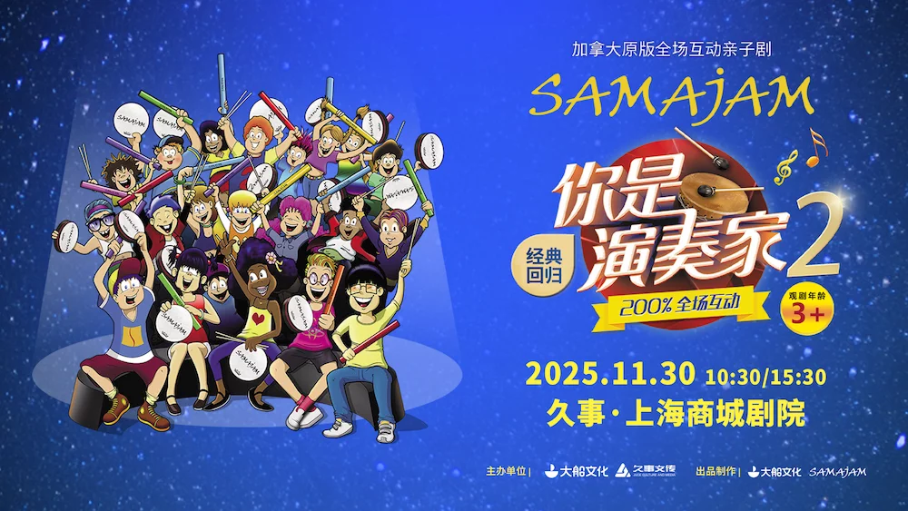 Samajam is a highly interactive family-friendly show that has taken North America by storm, now making its way to Shanghai. This live, high-energy performance blends music, rhythm, and English language learning, providing a 200% immersive experience for both kids and parents. Children will engage with the performers using musical instruments, including drums and color tubes, while learning basic English phrases like "left," "right," and "so good" through fun, dynamic games. It's an energetic and educational performance designed to ignite creativity and foster family bonding. Recommended for audiences 3 years old and above.
