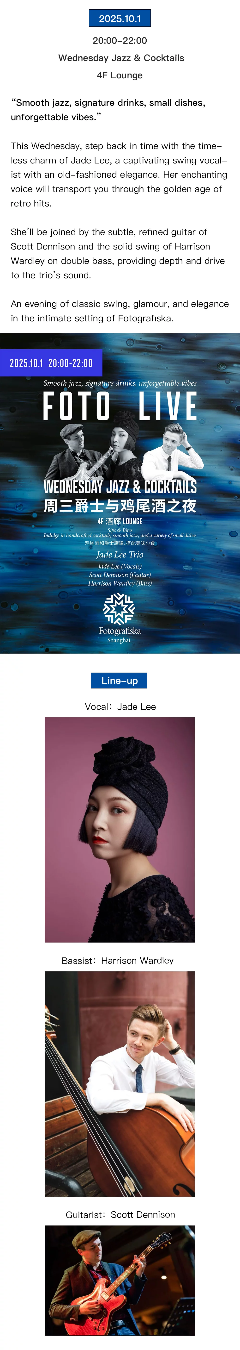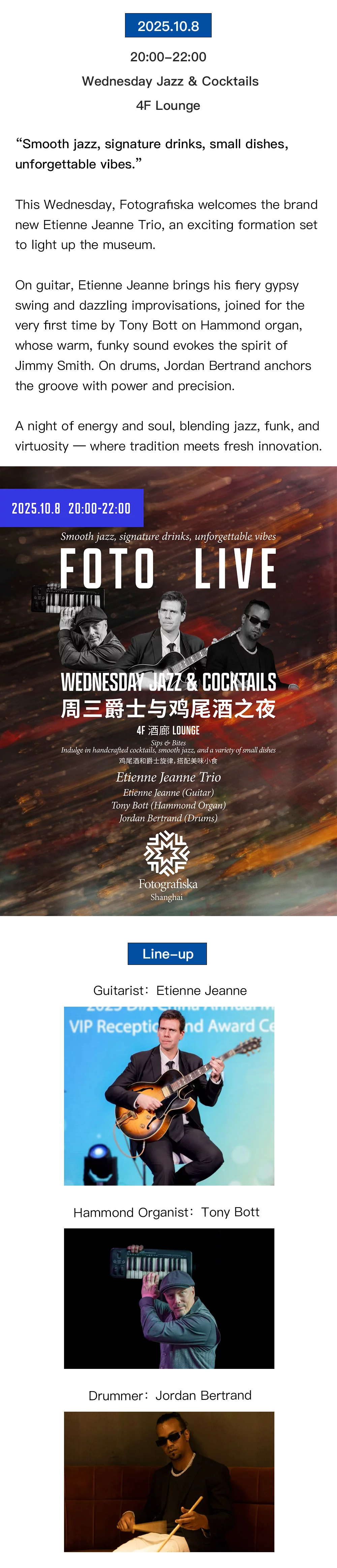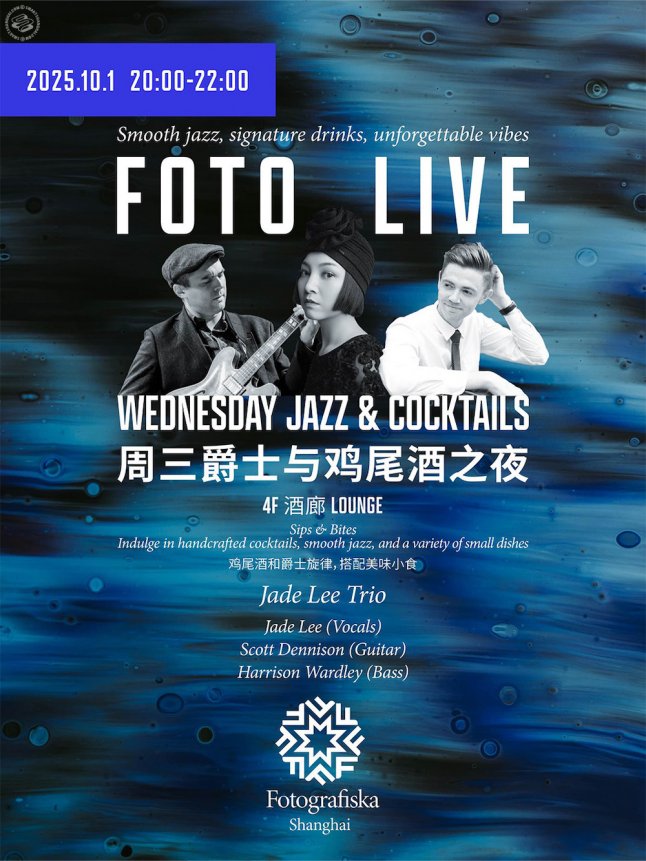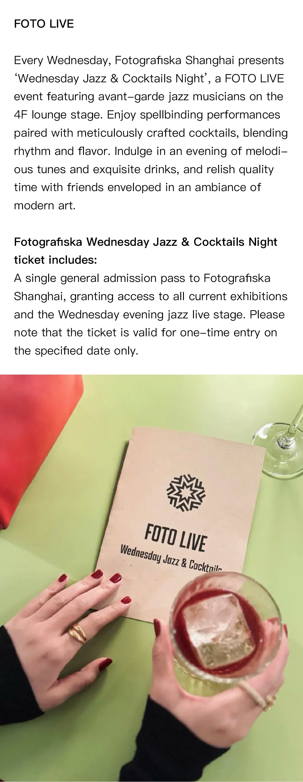 Every Wednesday, Fotografska Shanghai hosts Wednesday Jazz & Cocktails Night, featuring avant-garde jazz performances on the 4F lounge stage. Enjoy an evening of live music, expertly crafted cocktails, and modern art in a relaxed yet vibrant atmosphere.