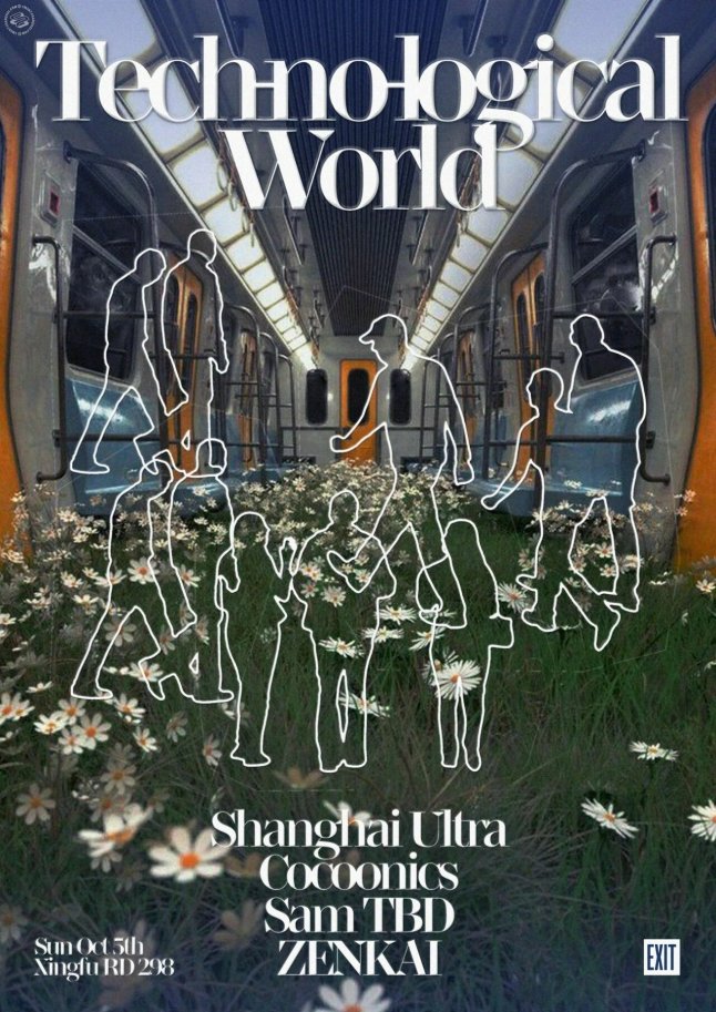 EXIT hosts Tech-no-logical World, a late-night techno showcase running from 10pm until late (free entry after 3am). The lineup spans local heavyweights and international names: Sam Tbd (formerly Mau Mau, ex-Elevator music director and founder of MEDUSA), Hong Kong-born experimental live artist Cocoonics, masked Shanghai techno O.G. Shanghai Ultra (VOID co-founder, Shelter resident), and high-velocity producer/DJ ZENKAI. Expect everything from hard minimal and Detroit-inspired grooves to immersive live sets blending body, sound, and visuals.