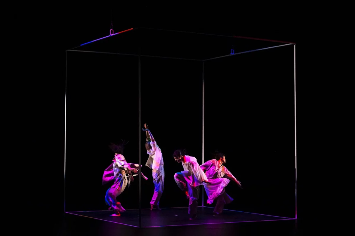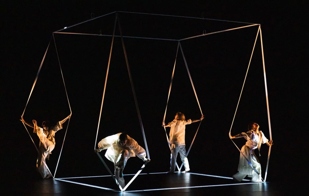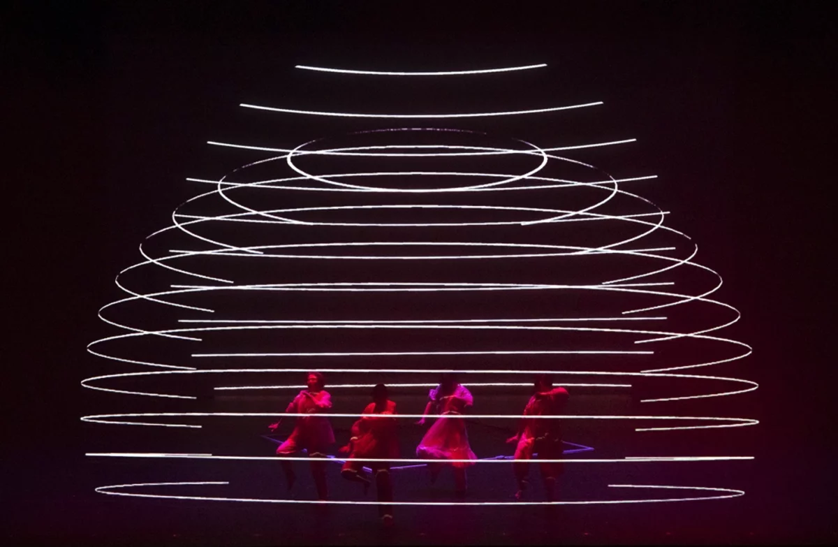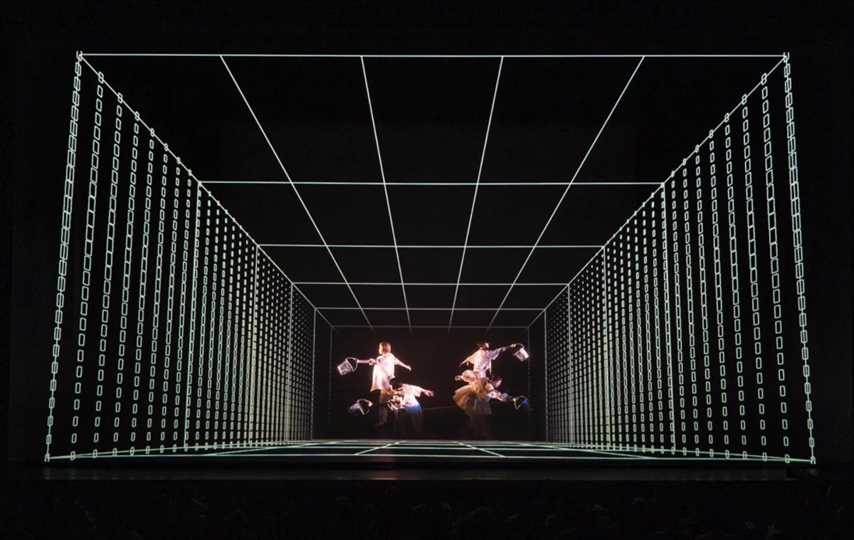 The work explores the themes of time, structure, and repetition through advanced “volumetric capture” technology, where dancers’ movements are recorded in real time and mirrored by algorithm-generated visuals.