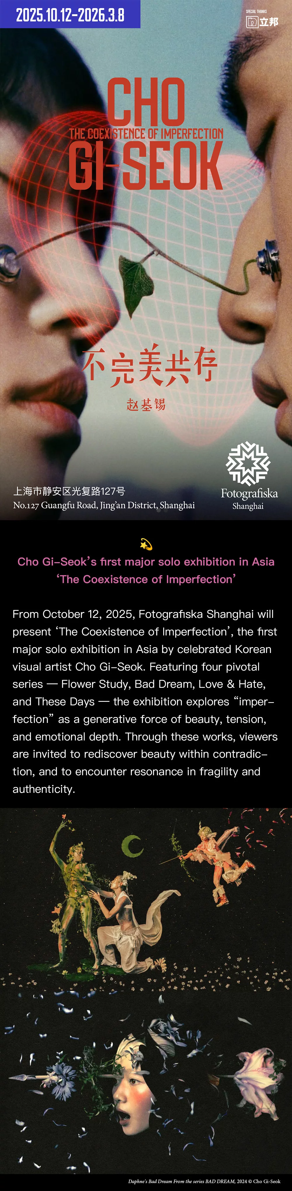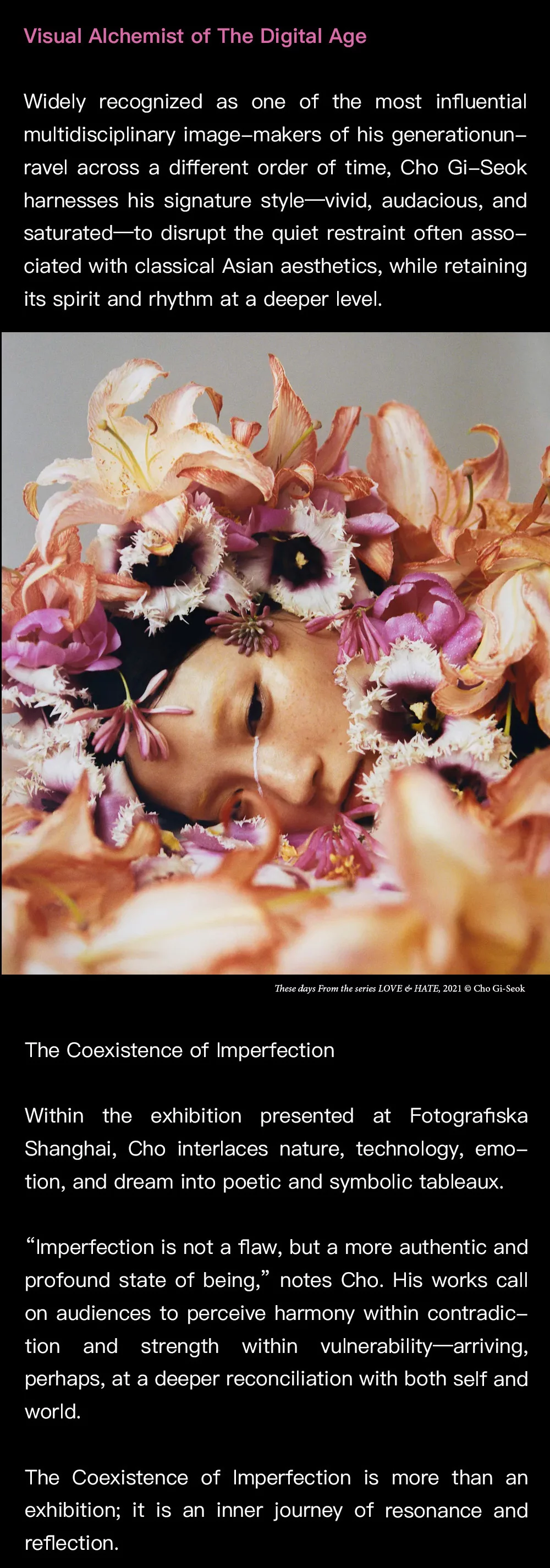 Fotografiska Shanghai presents The Coexistence of Imperfection, the first major solo exhibition in Asia by celebrated Korean visual artist Cho Gi-Seok, opening October 12, 2025. The show features four key series—Flower Study, Bad Dream, Love & Hate, and These Days—exploring imperfection as a source of beauty, tension, and emotional depth. Visitors are invited to experience a journey through contradiction and fragility, discovering harmony and resonance in both art and self.