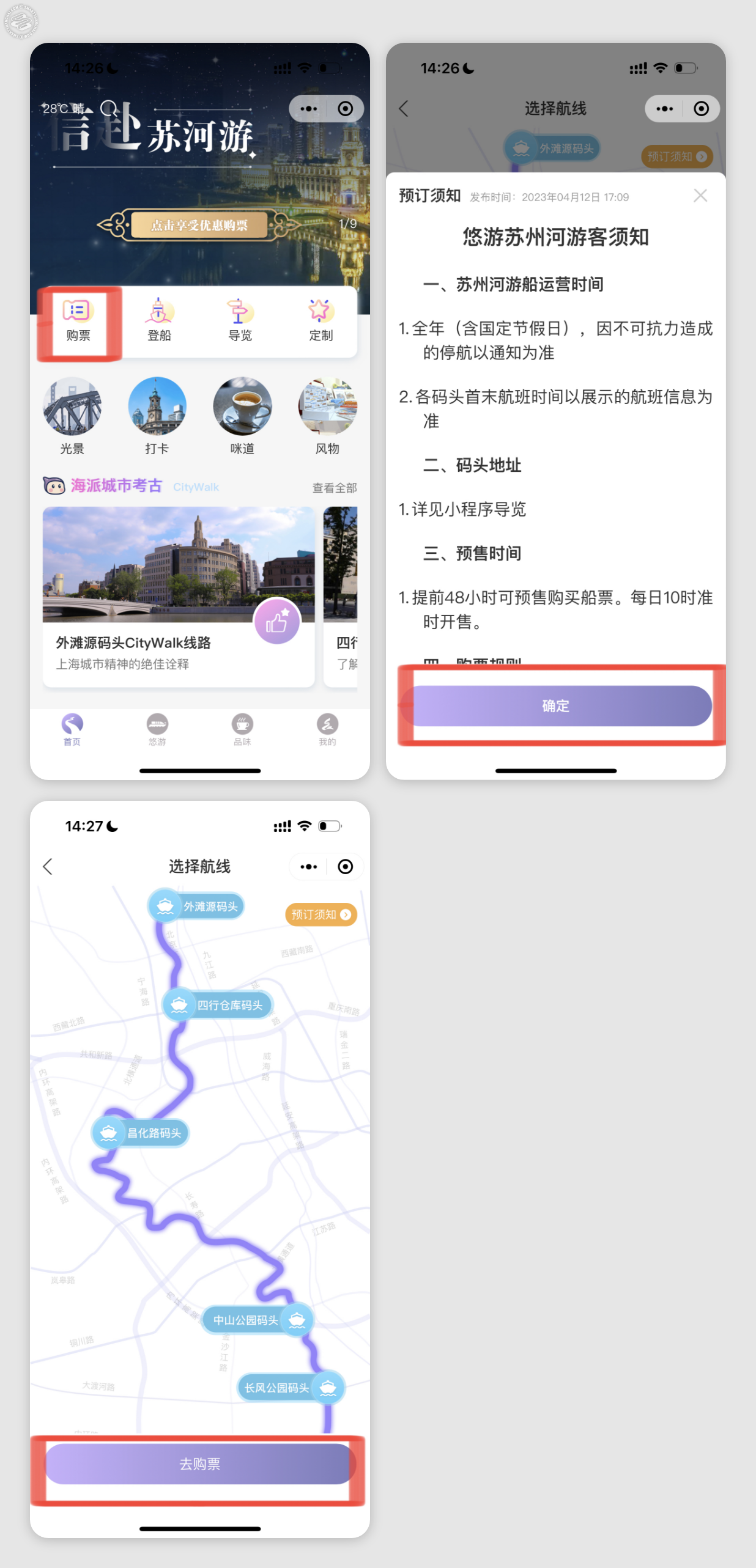 Below is a step-by-step guide to purchasing tickets via the "You You Su Zhou He" (悠游苏州河) WeChat mini-program.