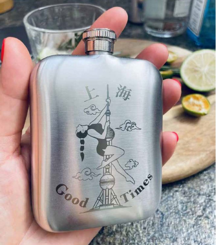 Food-grade stainless steel flask with unique design by too hao, coming with funnel. Available to choose from 2 engraving designs: Dancer, and Dragon. Size: 115 * 80mm.