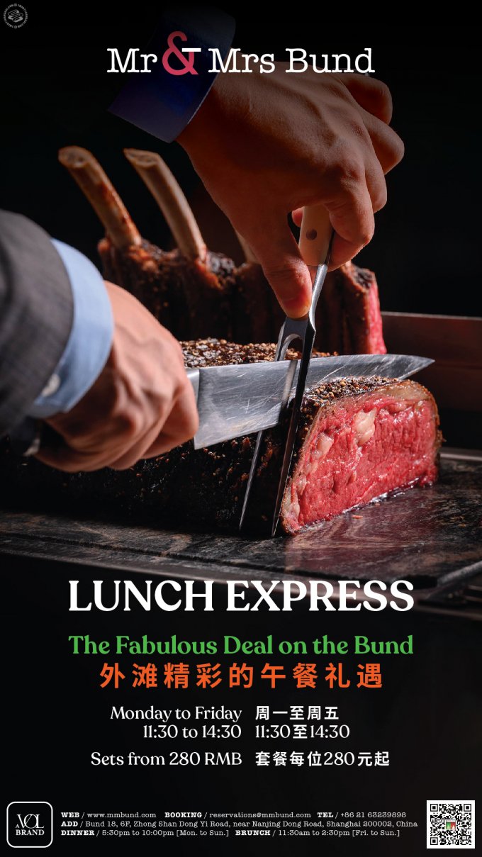 Lunch Express is available Monday to Friday from 11:30am to 2:30pm at Mr & Mrs Bund, offering a relaxed dining experience with comfortable flavors and stunning Bund views. Set menus start from 280rmb per person, making it a great option for a midday break or casual gathering. Available on weekdays, excluding national holidays; the menu is refreshed monthly.