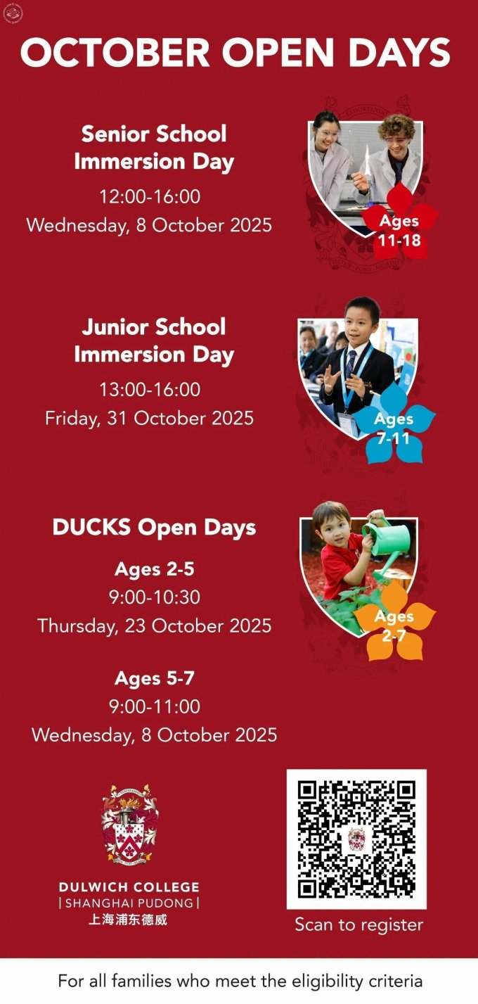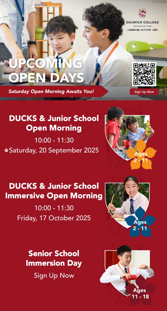 Families can scan the QR code on the poster to register for Dulwich Pudong Kindergarten Open Days (for ages 5-7). Dulwich Pudong looks forward to welcoming families to the campus.