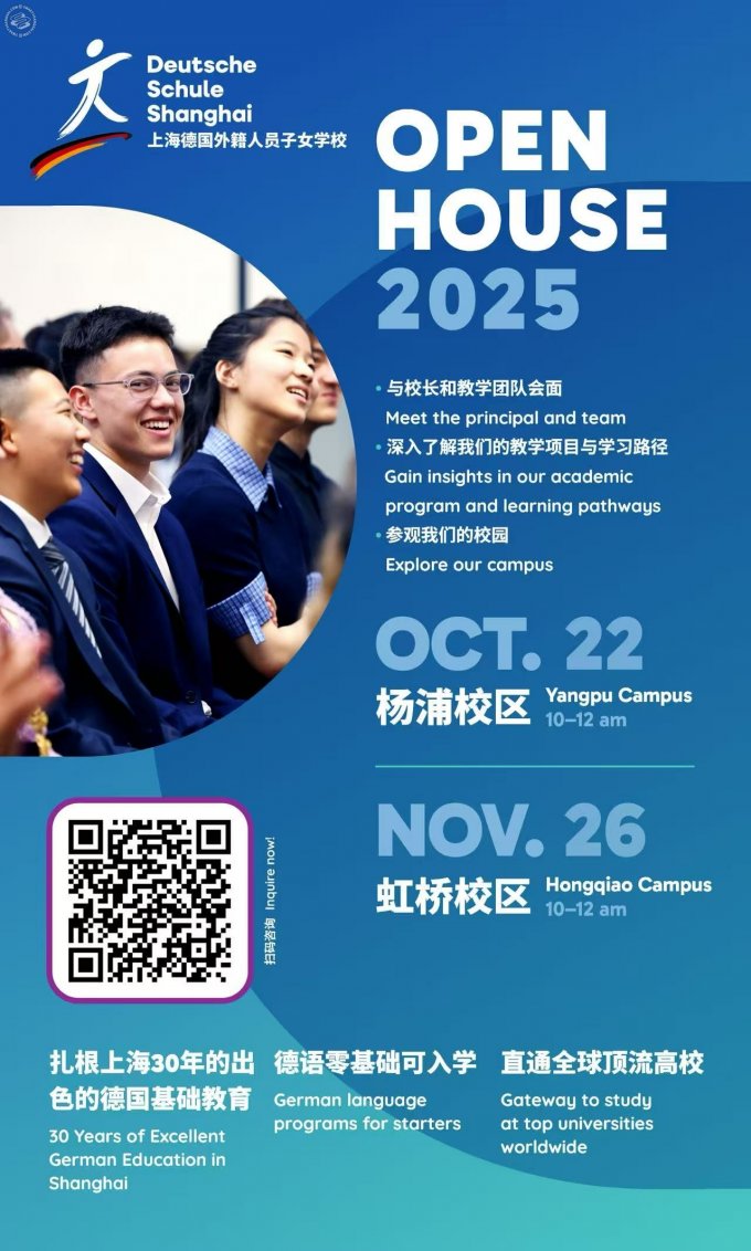 One of the world’s largest German School Abroad – recognised by the German Conference of the Ministers of Education, German School Shanghai (DSS), offers excellent German education from kindergarten to high school diploma. With nearly three decades history and experience in Shanghai, the two campuses - Hongqiao and Yangpu - along with the 1,100 students from 40 different countries welcome you to join this great community and its upcoming open days at Yangpu Campus on Oct 22 and at Hongqiao Campus on Nov 26, you will meet the principals, educational and admissions teams, to experience the German culture and know more about the German education.